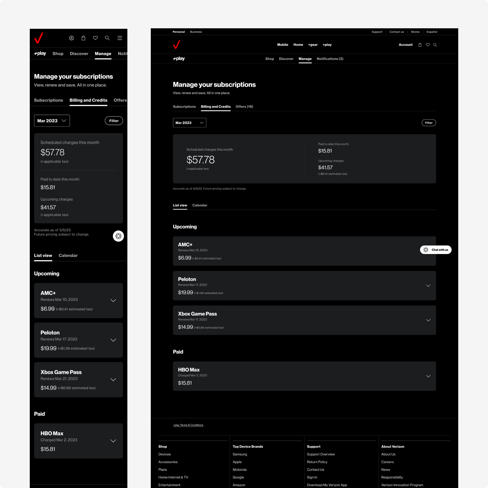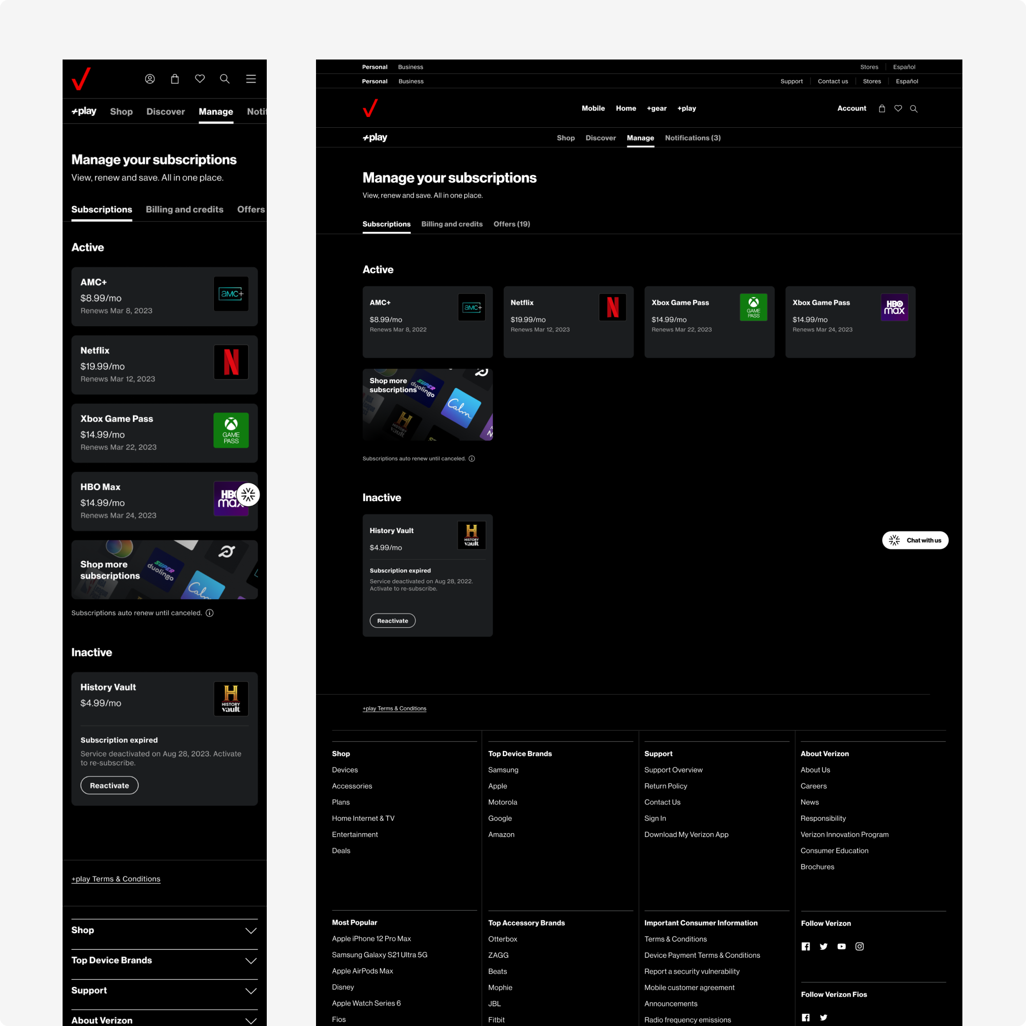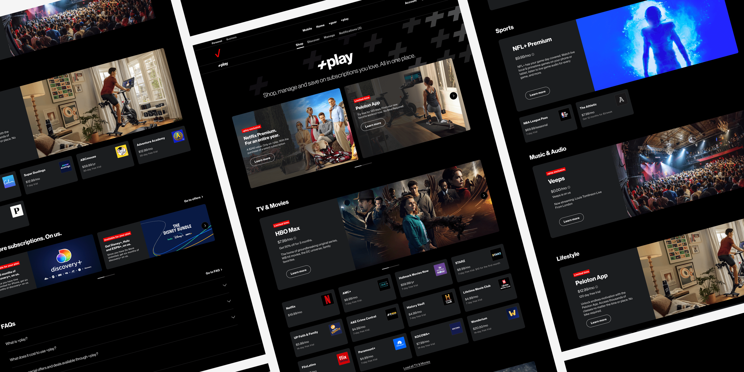 While adhering to the new Verizon Design System, our team worked to create custom components and utilized a dark mode experience, giving +play a unique brand language that fits within the Verizon ecosystem.